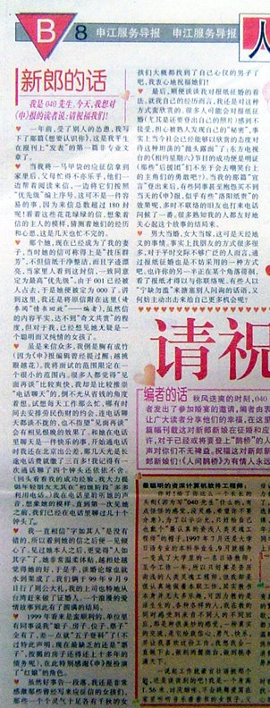 最后,顺便谈谈我对报纸征婚的看法。就我自己的经历而言,我还是对这种方式蛮欣赏的。很多人可能会对报纸征婚(尤其是还要登出自己的照片)感到不接受,担心被熟人发现自己的“秘密”,事实上当今社会已经能够以欣赏的态度对待这种坦荡的“抛头露面”了:东方电视台的《相约星期六》节目的成功便是明证(那些“后援团”们不至于会去嘲笑台上的主角们的勇敢吧?)。当我那篇“宣言”登出来后,有些同事甚至抱怨买不到当天的《申》报,似乎有些“洛阳纸贵”的效果呢,多时不联络的旧友也打来电话问候了一番。很多熟识我的人都友好地关心起这个故事的结局来。